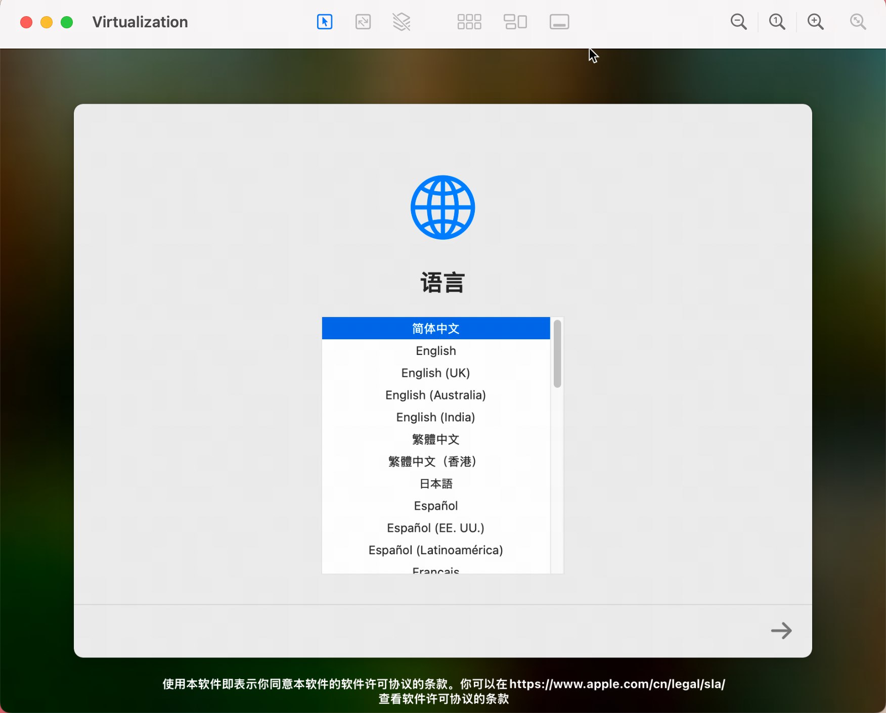 这会下载 macOS 并创建虚拟机,VNC 窗口会自动打开。根据网络,下载可能需要一些时间(大概15GB)。